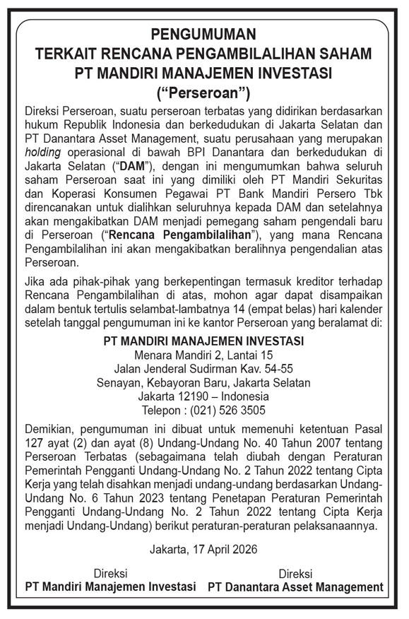 Jakarta, 17 April 2026 – In relation to the proposed acquisition of all shares of PT Mandiri Manajemen Investasi currently owned by PT Mandiri Sekuritas and Koperasi Konsumen Pegawai PT Bank Mandiri (Persero) Tbk by PT Danantara Asset Management (the “Proposed Acquisition”), the Proposed Acquisition will result in the transfer of control of the Company to PT Danantara Asset Management. We hereby inform that the Proposed Acquisition forms part of a strategic initiative in the consolidation of the asset management industry of State-Owned Enterprises (BUMN) under the Himbara Bank Group to strengthen governance, improve efficiency, and create a more optimal economic scale in the national financial sector.